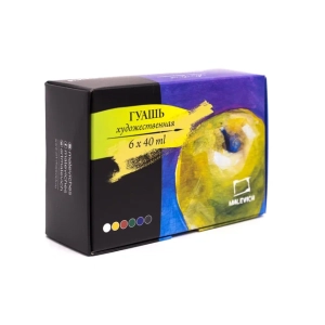 Гуашь Малевичъ, набор 6 цветов по 40 мл. Водорастворимая, комфортная для работы краска приятной кремовой консистенцией и повышенной концентрацией пигмента. Высокая кроющая способность позволяет наносить четкие мелкие непрозрачные детали светлых тонов на фон темного оттенка. После высыхания поверхность становится бархатисто-матовой.