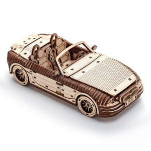 Сборная модель из дерева представляет собой кабриолет с большой детализацией, у которого открываются двери, капот и багажник, а так же крутятся колеса. А, чтобы играть с детьми было еще веселее вы можете раскрасить модель в любимые цвета.